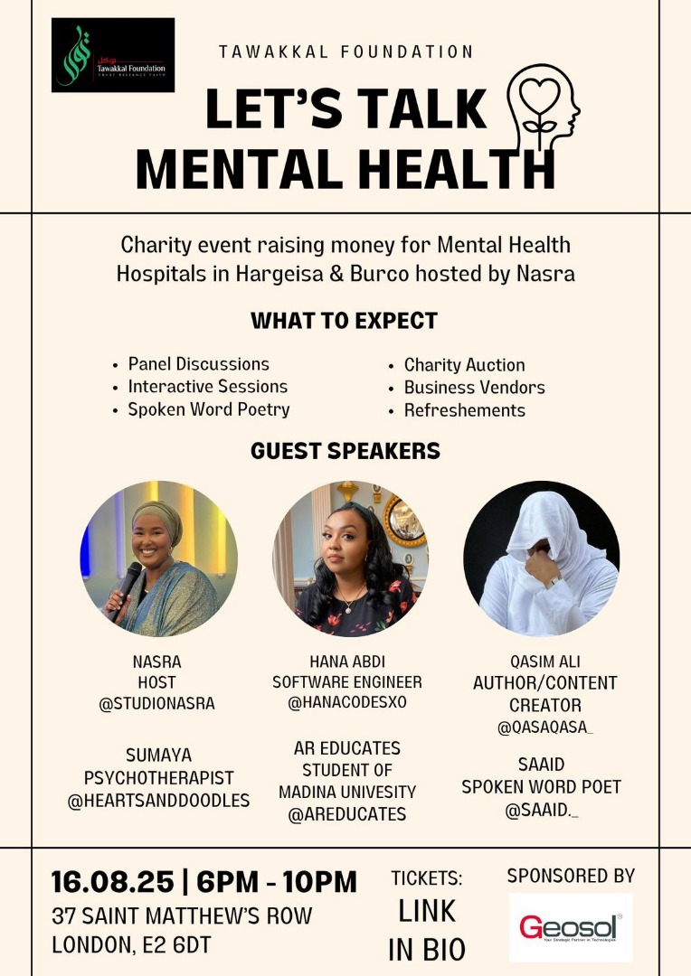 Geosol Technologies is proud to sponsor the Mental Health Awareness Charity Event organized by Tawakkal Foundation, taking place on 16th August 2025 in London, UK.